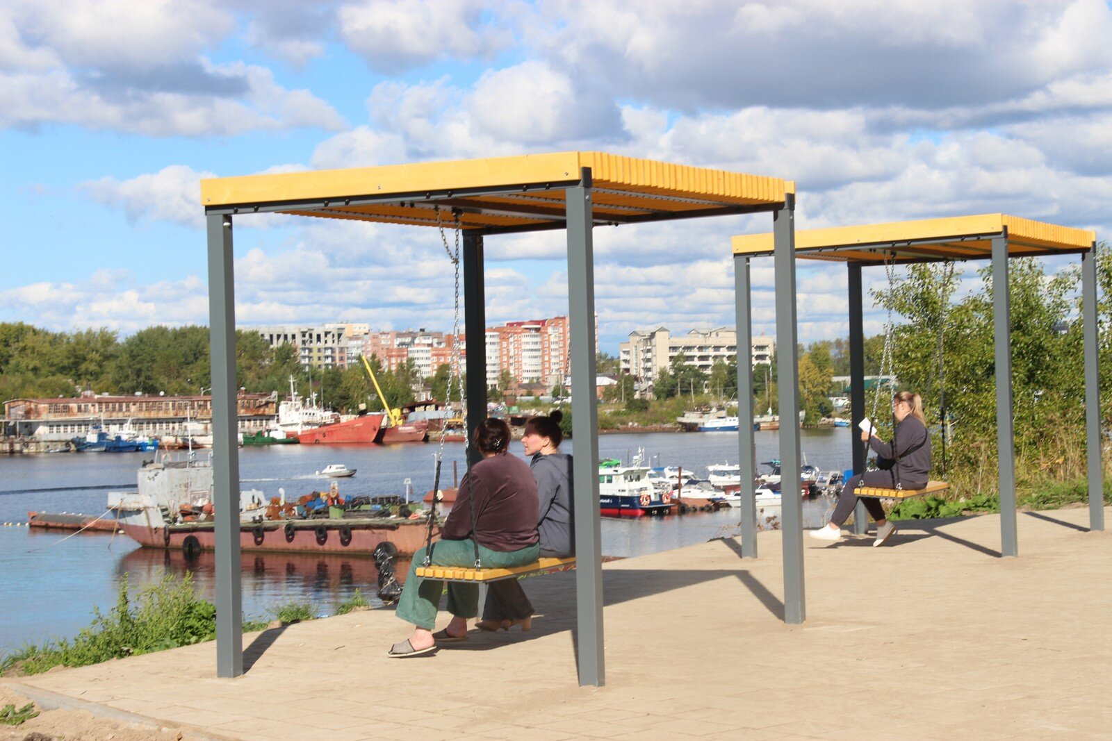 Уже совсем скоро ожидается завершение установки световых опор и малых архитектурных форм. Жители города не стали дожидаться официального открытия и уже облюбовали качели и лавочки с уютным видом на сентябрьскую Северную Двину. Делимся солнечными кадрами в фоторепортаже Романа Филковского.