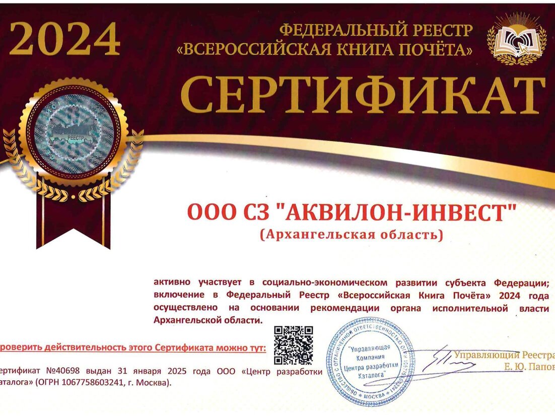 Группа Аквилон включена в Федеральный Реестр «Всероссийская Книга Почёта»