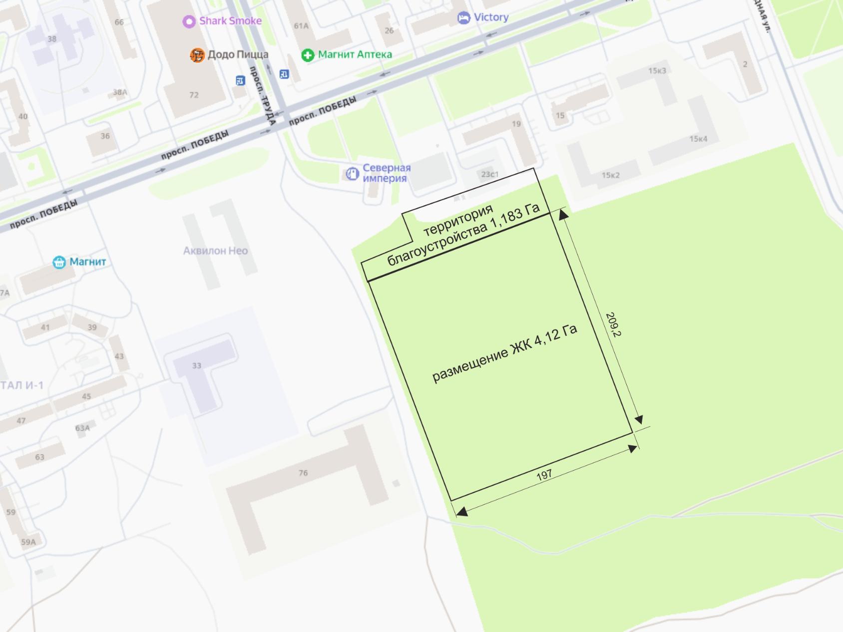 Также в рамках аукциона компанией приобретен земельный участков площадью 4,12 га в районе пр. Победы — пр. Труда. Здесь запланировано строительство 9-этажного жилого комплекса площадью около 36 тыс. кв. м. Помимо этого Группа Аквилон выполнит благоустройство муниципального участка площадью 1,18 га.