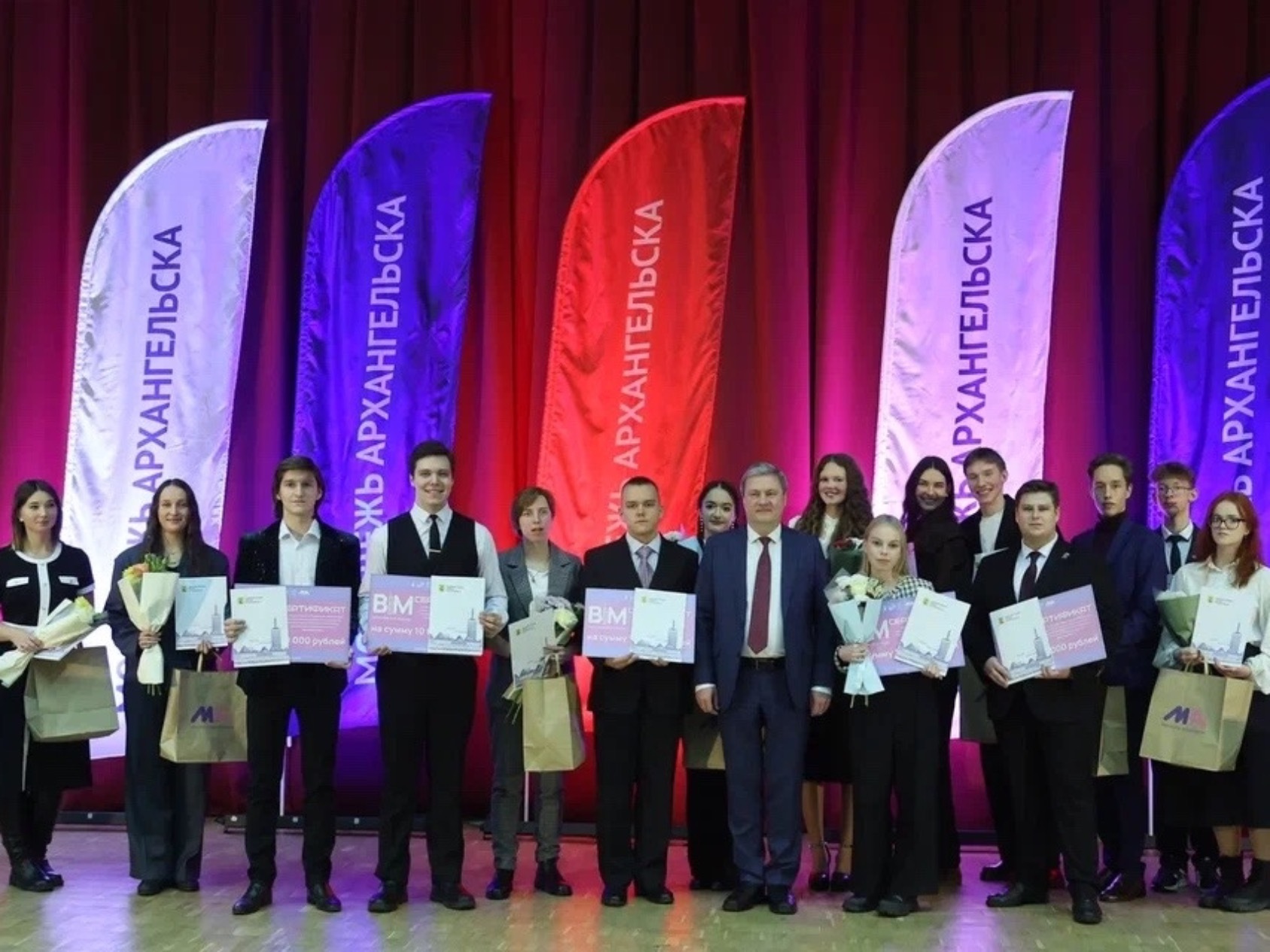 Пятеро представителей молодёжных движений были отмечены премиями городской администрации в размере 10 тысяч рублей. Слова поддержки и напутствия участникам адресовал глава Архангельска Дмитрий Морев.