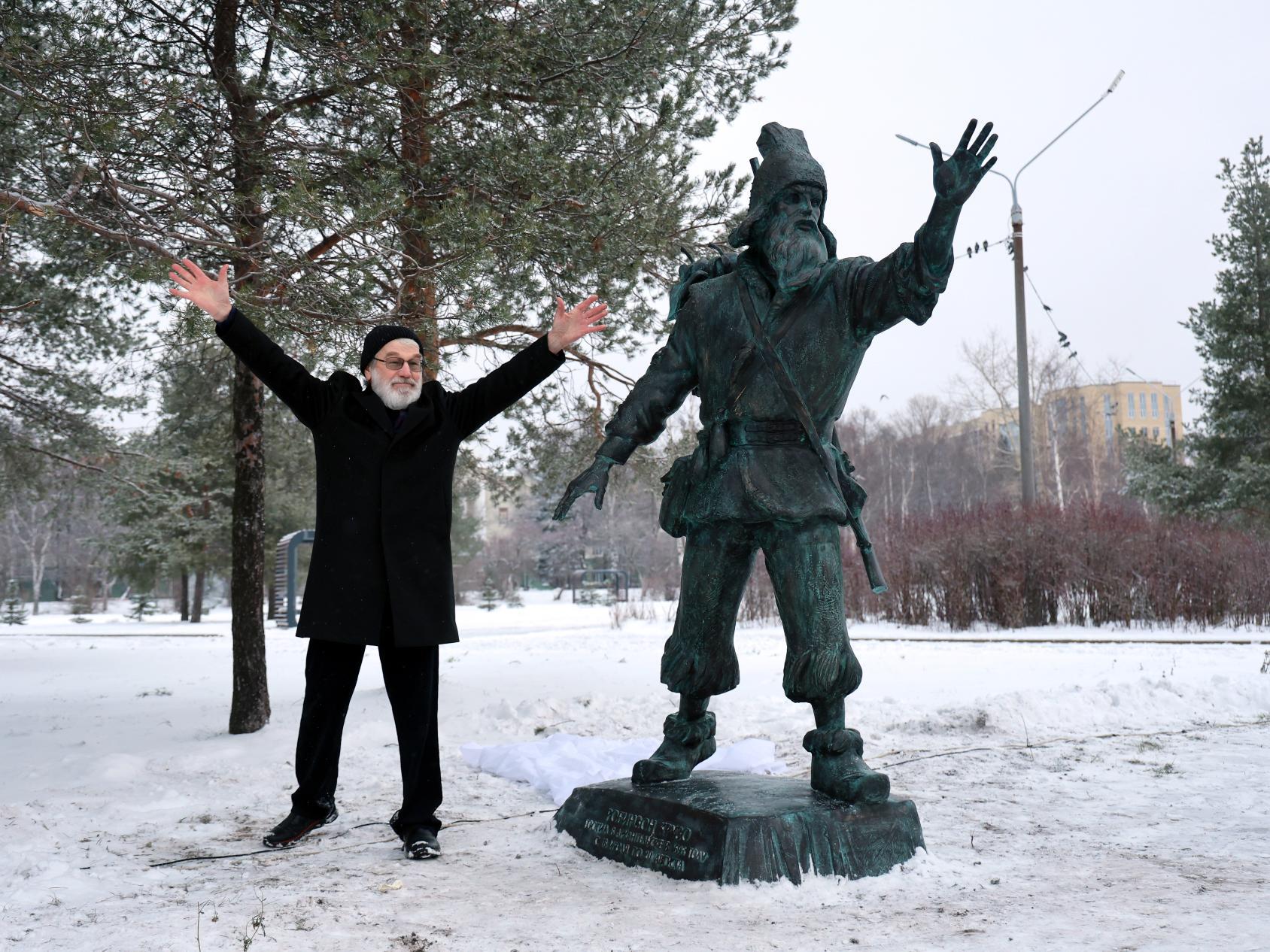 – В мире есть два памятника Робинзону. Один — в Великобритании, в маленькой шотландской деревушке, где родился прототип литературного героя. Памятник был установлен в 1885 году. Скульптор — Томас Стюарт Бернетт. Второй памятник — в Тобольске. Скульптор — Алексей Тютнев, 2007 год. На мой взгляд и вкус, Робинзон Сюхина в сравнении с ними наиболее удачен. Не надо гадать, кто это, издалека виден, это знакомый нам с детства Робинзон.
