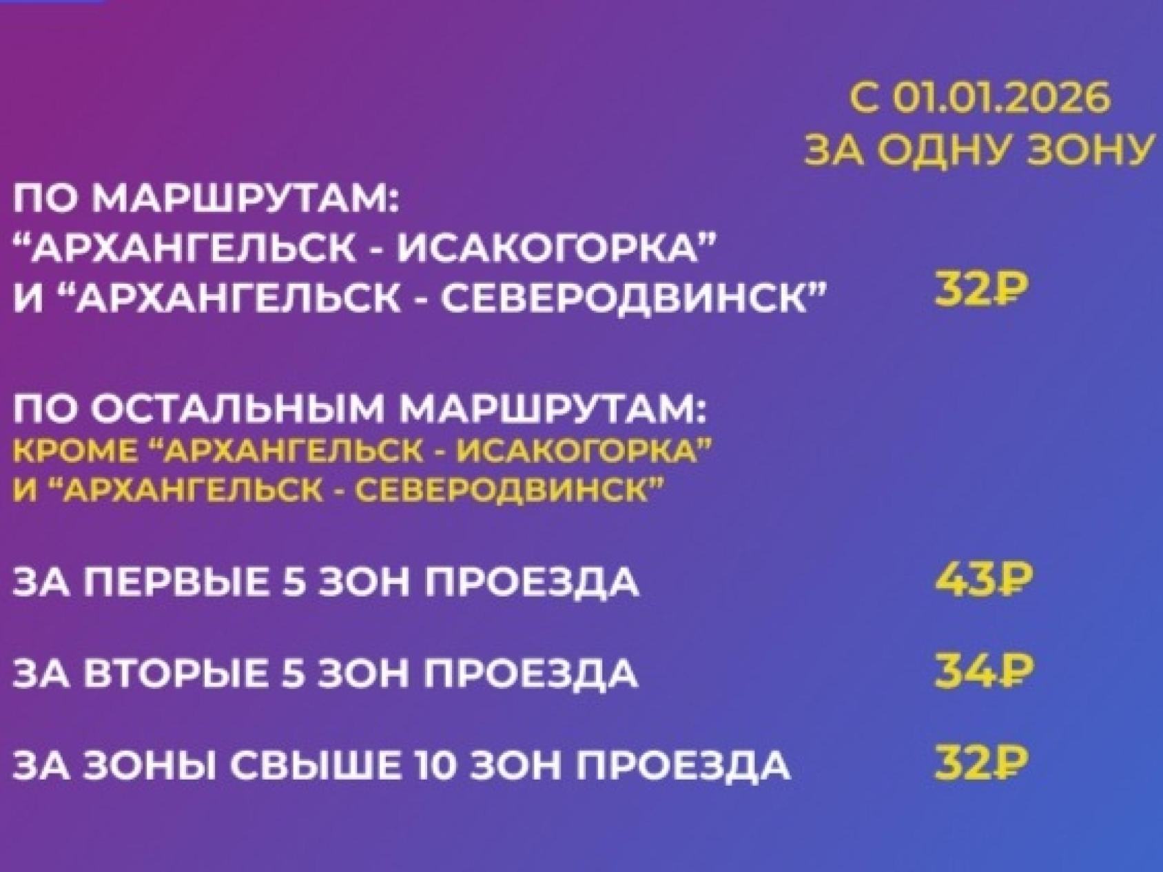 На маршрутах «Архангельск — Исакогорка» и «Архангельск — Северодвинск» стоимость проезда за одну зону составит 32 рубля.