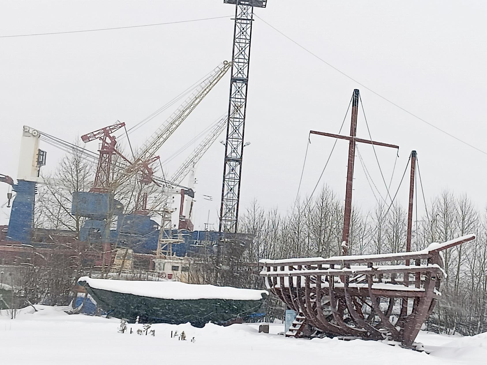 Да, мы стоим на этом самом месте — историчнее не бывает! Но всё же это промзона — холодная для сердца и чувств. Но вдруг вижу большую деревянную поморскую ладью, затерявшуюся в снежной дымке. Она — на фоне больших кораблей: рядом завод «Красная кузница», где проходит их ремонт. И оттуда даже слышны звуки рабочего процесса.