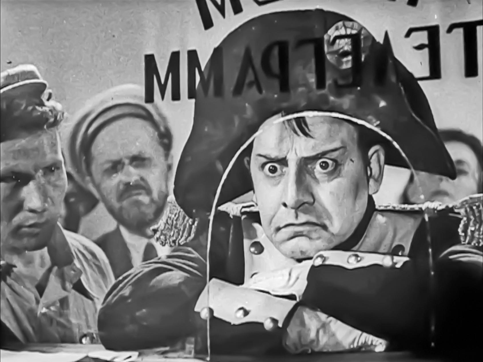 И не только в газетах появлялись материалы на такие темы, современные любители военной истории наверняка вспомнят советский киноальманах «Боевой киносборник № 2» (12+) 1941 года, созданный на Ленинградской киностудии. Киношутка «Случай на телеграфе»: стоит очередь к окошечку, какой‑то гражданин протягивает бланк телеграммы без очереди. Люди возмущаются, но потом замолкают, чем‑то поражённые. Девушка-кассир читает вслух телеграмму-молнию, адресованную в Берлин: «Не советую. Пробовал. Не вышло». Камера поднимается выше: в окошечке телеграфа появляется узнаваемый образ Наполеона…