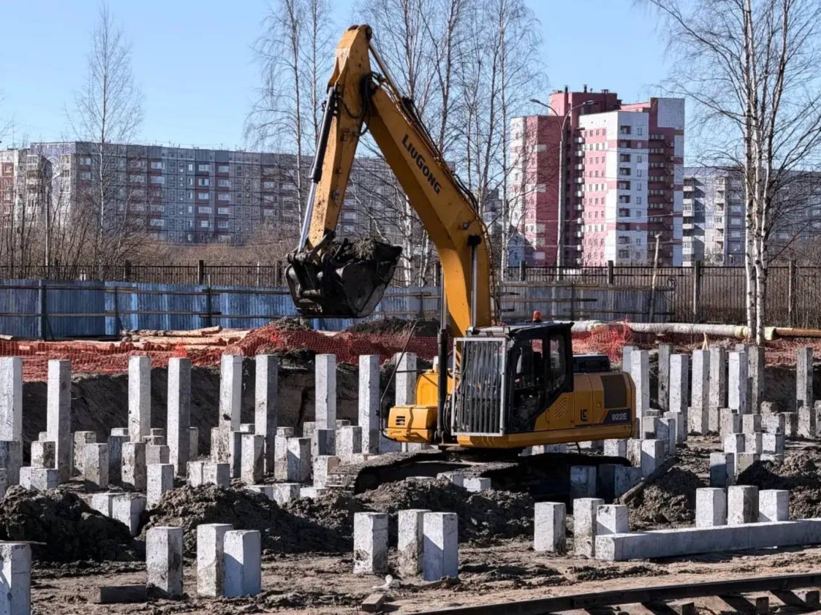В настоящее время на площадке ведутся подготовительные работы и устройство свайного поля. Уже погружено более 500 свай, что значительно превышает план. Подрядчику поставлена задача полностью закрыть тепловой контур здания до конца года.