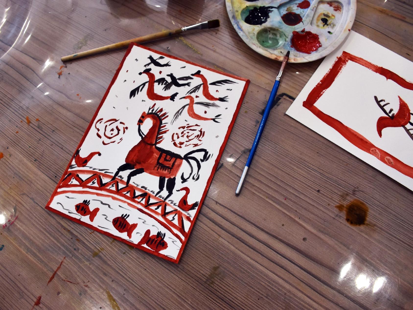 Участники встречи познакомились с мезенской росписью – одним из самобытных русских народных промыслов. Гости узнали об истории направления, характерных сюжетах и предметах, которые традиционно украшали мастера. В завершение каждый, кто принимал участие в мастер-классе, создал собственный сувенир – открытку с изображением знаменитой красной лошади.