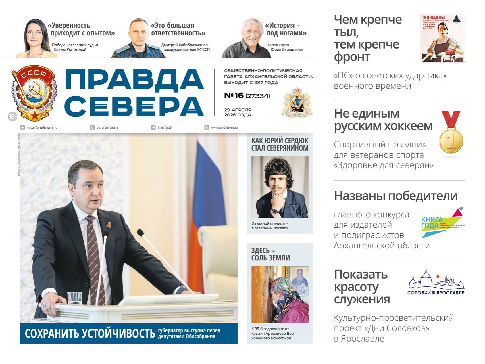 На 3 странице нового выпуска «Правда Севера» рассказывает о ключевых событиях в политике региона и подводит итоги вместе с губернатором Поморья Александром Цыбульским. Здесь же вы можете прочитать о проектах благоустройства Сольвычегодска и Новодвинска, которые включили в федеральный реестр лучших практик 2025 года.